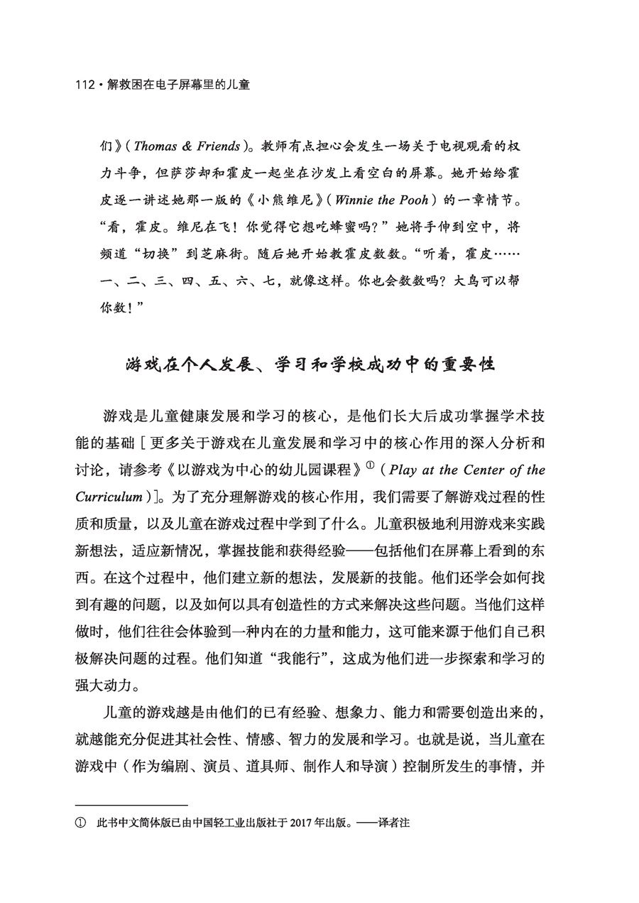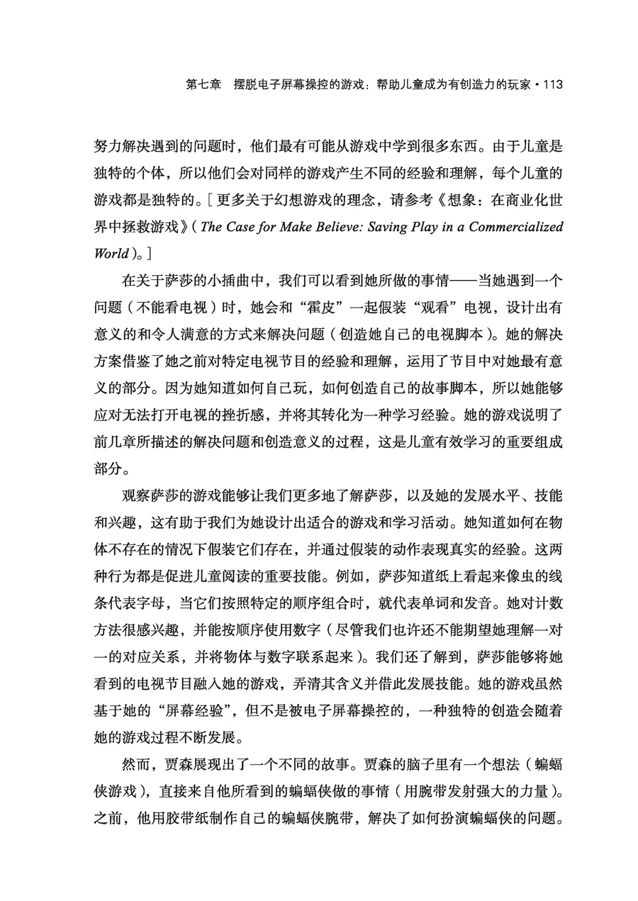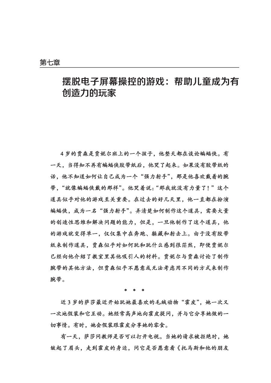 4岁的贾森是贾妮尔班上的一个孩子,他整天都在谈论蝙蝠侠。有一天,当得知不再有蝙蝠侠胶带纸后,他哭了起来。如果没有胶带纸的话,他不知道如何让自己成为一个“强力射手”,那是他喜欢戴着的腕带,“就像蝙蝠侠戴的那样”。他哭着说:“那我就没有力量了!”这个道具似乎对他的游戏至关重要。在过去的好几天里,他一直都在扮演蝙蝠侠,成为一名“强力射手”。弄清楚如何制作这个道具,需要大量的创造性思维和解决问题的能力,但是,一旦他制作了这个道具,他的游戏就变得单一,仅仅集中在奔跑、躲藏和射击上。由于没有胶带纸来制作道具,贾森似乎对如何玩和玩什么感到很茫然,即便贾妮尔已经向他介绍了教室里其他吸引人的材料。贾妮尔与贾森讨论了制作腕带的其他方法,但贾森似乎不愿意或无法考虑用不同的方式来制作腕带。 * * * 近3岁的萨莎最近开始玩她最喜欢的毛绒动物“霍皮”,她一次又一次地假装和它互动。她经常高声地向霍皮提问,并与它分享她做的一切事情。有时,她会假装跟霍皮分享她的零食。 有一天,萨莎问教师是否可以打开电视。当她的请求被拒绝时,她皱起了眉头,走到霍皮的身边,问它是否愿意看《托马斯和他的朋友们》(Thomas & Friends)。教师有点担心会发生一场关于电视观看的权力斗争,但萨莎却和霍皮一起坐在沙发上看空白的屏幕。她开始给霍皮逐一讲述她那一版的《小熊维尼》(Winnie the Pooh)的一章情节。“看,霍皮。维尼在飞!你觉得它想吃蜂蜜吗?”她将手伸到空中,将频道“切换”到芝麻街。随后她开始教霍皮数数。“听着,霍皮……一、二、三、四、五、六、七,就像这样。你也会数数吗?大鸟可以帮你数!” 游戏在个人发展、学习和学校成功中的重要性 游戏是儿童健康发展和学习的核心,是他们长大后成功掌握学术技能的基础[更多关于游戏在儿童发展和学习中的核心作用的深入分析和讨论,请参考《以游戏为中心的幼儿园课程》(Play at the Center of the Curriculum)]。为了充分理解游戏的核心作用,我们需要了解游戏过程的性质和质量,以及儿童在游戏过程中学到了什么。儿童积极地利用游戏来实践新想法,适应新情况,掌握技能和获得经验——包括他们在屏幕上看到的东西。在这个过程中,他们建立新的想法,发展新的技能。他们还学会如何找到有趣的问题,以及如何以具有创造性的方式来解决这些问题。当他们这样做时,他们往往会体验到一种内在的力量和能力,这可能来源于他们自己积极解决问题的过程。他们知道“我能行”,这成为他们进一步探索和学习的强大动力。 儿童的游戏越是由他们的已有经验、想象力、能力和需要创造出来的,就越能充分促进其社会性、情感、智力的发展和学习。也就是说,当儿童在游戏中(作为编剧、演员、道具师、制作人和导演)控制所发生的事情,并努力解决遇到的问题时,他们最有可能从游戏中学到很多东西。由于儿童是独特的个体,所以他们会对同样的游戏产生不同的经验和理解,每个儿童的游戏都是独特的。[更多关于幻想游戏的理念,请参考《想象:在商业化世界中拯救游戏》(The Case for Make Believe: Saving Play in a Commercialized World)。] 在关于萨莎的小插曲中,我们可以看到她所做的事情——当她遇到一个问题(不能看电视)时,她会和“霍皮”一起假装“观看”电视,设计出有意义的和令人满意的方式来解决问题(创造她自己的电视脚本)。她的解决方案借鉴了她之前对特定电视节目的经验和理解,运用了节目中对她最有意义的部分。因为她知道如何自己玩,如何创造自己的故事脚本,所以她能够应对无法打开电视的挫折感,并将其转化为一种学习经验。她的游戏说明了前几章所描述的解决问题和创造意义的过程,这是儿童有效学习的重要组成部分。 观察萨莎的游戏能够让我们更多地了解萨莎,以及她的发展水平、技能和兴趣,这有助于我们为她设计出适合的游戏和学习活动。她知道如何在物体不存在的情况下假装它们存在,并通过假装的动作表现真实的经验。这两种行为都是促进儿童阅读的重要技能。例如,萨莎知道纸上看起来像虫的线条代表字母,当它们按照特定的顺序组合时,就代表单词和发音。她对计数方法很感兴趣,并能按顺序使用数字(尽管我们也许还不能期望她理解一对一的对应关系,并将物体与数字联系起来)。我们还了解到,萨莎能够将她看到的电视节目融入她的游戏,弄清其含义并借此发展技能。她的游戏虽然基于她的“屏幕经验”,但不是被电子屏幕操控的,一种独特的创造会随着她的游戏过程不断发展。 然而,贾森展现出了一个不同的故事。贾森的脑子里有一个想法(蝙蝠侠游戏),直接来自他所看到的蝙蝠侠做的事情(用腕带发射强大的力量)。之前,他用胶带纸制作自己的蝙蝠侠腕带,解决了如何扮演蝙蝠侠的问题。但他发现,如果他不能制作腕带,那么他就不能玩蝙蝠侠游戏。即使他能够制作腕带,他的游戏也是重复的;他反复使用腕带的暴力动作,没有建立在扩展游戏的基础上。他似乎无法找到新的、有趣的问题,也无法掌握新的技能和想法。他在这个过程中被困住了,因此他通过游戏来学习的能力受到了影响。(更多关于媒体暴力如何影响暴力游戏的深入讨论,请参考《战争游戏的困境》。) 关于贾森在游戏过程中的行为和表现的描述与那些努力避免由数