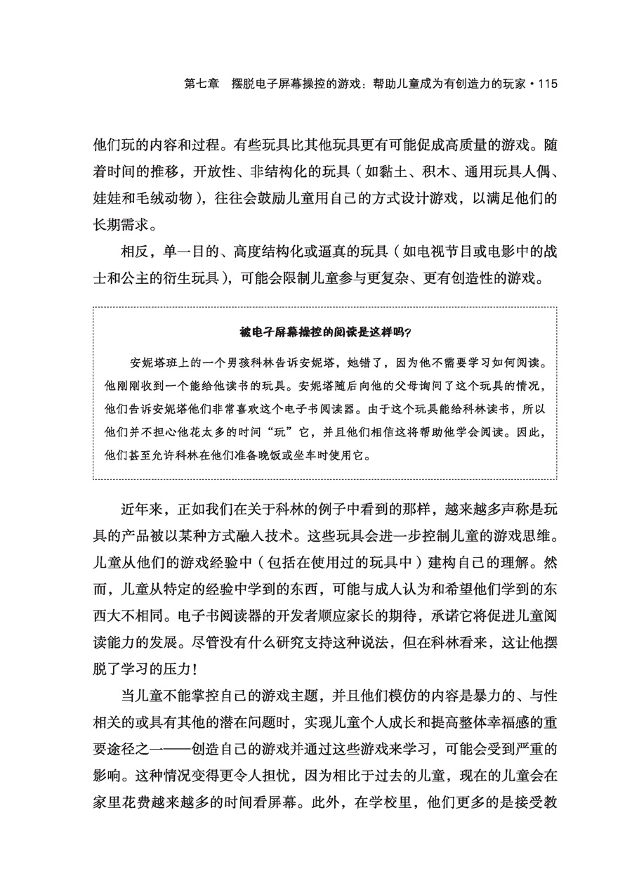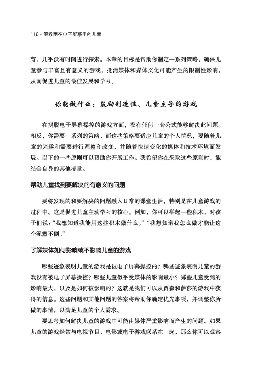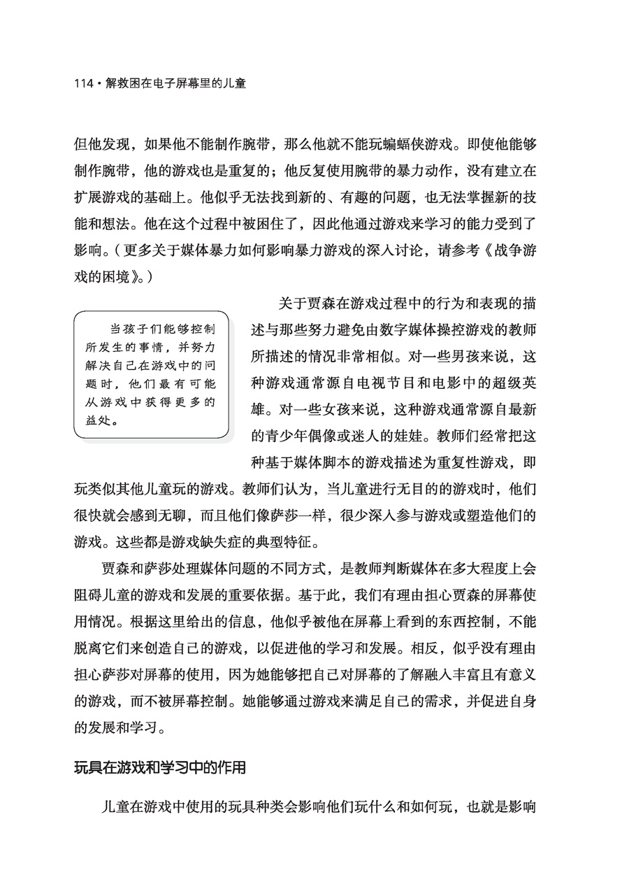 4岁的贾森是贾妮尔班上的一个孩子,他整天都在谈论蝙蝠侠。有一天,当得知不再有蝙蝠侠胶带纸后,他哭了起来。如果没有胶带纸的话,他不知道如何让自己成为一个“强力射手”,那是他喜欢戴着的腕带,“就像蝙蝠侠戴的那样”。他哭着说:“那我就没有力量了!”这个道具似乎对他的游戏至关重要。在过去的好几天里,他一直都在扮演蝙蝠侠,成为一名“强力射手”。弄清楚如何制作这个道具,需要大量的创造性思维和解决问题的能力,但是,一旦他制作了这个道具,他的游戏就变得单一,仅仅集中在奔跑、躲藏和射击上。由于没有胶带纸来制作道具,贾森似乎对如何玩和玩什么感到很茫然,即便贾妮尔已经向他介绍了教室里其他吸引人的材料。贾妮尔与贾森讨论了制作腕带的其他方法,但贾森似乎不愿意或无法考虑用不同的方式来制作腕带。 * * * 近3岁的萨莎最近开始玩她最喜欢的毛绒动物“霍皮”,她一次又一次地假装和它互动。她经常高声地向霍皮提问,并与它分享她做的一切事情。有时,她会假装跟霍皮分享她的零食。 有一天,萨莎问教师是否可以打开电视。当她的请求被拒绝时,她皱起了眉头,走到霍皮的身边,问它是否愿意看《托马斯和他的朋友们》(Thomas & Friends)。教师有点担心会发生一场关于电视观看的权力斗争,但萨莎却和霍皮一起坐在沙发上看空白的屏幕。她开始给霍皮逐一讲述她那一版的《小熊维尼》(Winnie the Pooh)的一章情节。“看,霍皮。维尼在飞!你觉得它想吃蜂蜜吗?”她将手伸到空中,将频道“切换”到芝麻街。随后她开始教霍皮数数。“听着,霍皮……一、二、三、四、五、六、七,就像这样。你也会数数吗?大鸟可以帮你数!” 游戏在个人发展、学习和学校成功中的重要性 游戏是儿童健康发展和学习的核心,是他们长大后成功掌握学术技能的基础[更多关于游戏在儿童发展和学习中的核心作用的深入分析和讨论,请参考《以游戏为中心的幼儿园课程》(Play at the Center of the Curriculum)]。为了充分理解游戏的核心作用,我们需要了解游戏过程的性质和质量,以及儿童在游戏过程中学到了什么。儿童积极地利用游戏来实践新想法,适应新情况,掌握技能和获得经验——包括他们在屏幕上看到的东西。在这个过程中,他们建立新的想法,发展新的技能。他们还学会如何找到有趣的问题,以及如何以具有创造性的方式来解决这些问题。当他们这样做时,他们往往会体验到一种内在的力量和能力,这可能来源于他们自己积极解决问题的过程。他们知道“我能行”,这成为他们进一步探索和学习的强大动力。 儿童的游戏越是由他们的已有经验、想象力、能力和需要创造出来的,就越能充分促进其社会性、情感、智力的发展和学习。也就是说,当儿童在游戏中(作为编剧、演员、道具师、制作人和导演)控制所发生的事情,并努力解决遇到的问题时,他们最有可能从游戏中学到很多东西。由于儿童是独特的个体,所以他们会对同样的游戏产生不同的经验和理解,每个儿童的游戏都是独特的。[更多关于幻想游戏的理念,请参考《想象:在商业化世界中拯救游戏》(The Case for Make Believe: Saving Play in a Commercialized World)。] 在关于萨莎的小插曲中,我们可以看到她所做的事情——当她遇到一个问题(不能看电视)时,她会和“霍皮”一起假装“观看”电视,设计出有意义的和令人满意的方式来解决问题(创造她自己的电视脚本)。她的解决方案借鉴了她之前对特定电视节目的经验和理解,运用了节目中对她最有意义的部分。因为她知道如何自己玩,如何创造自己的故事脚本,所以她能够应对无法打开电视的挫折感,并将其转化为一种学习经验。她的游戏说明了前几章所描述的解决问题和创造意义的过程,这是儿童有效学习的重要组成部分。 观察萨莎的游戏能够让我们更多地了解萨莎,以及她的发展水平、技能和兴趣,这有助于我们为她设计出适合的游戏和学习活动。她知道如何在物体不存在的情况下假装它们存在,并通过假装的动作表现真实的经验。这两种行为都是促进儿童阅读的重要技能。例如,萨莎知道纸上看起来像虫的线条代表字母,当它们按照特定的顺序组合时,就代表单词和发音。她对计数方法很感兴趣,并能按顺序使用数字(尽管我们也许还不能期望她理解一对一的对应关系,并将物体与数字联系起来)。我们还了解到,萨莎能够将她看到的电视节目融入她的游戏,弄清其含义并借此发展技能。她的游戏虽然基于她的“屏幕经验”,但不是被电子屏幕操控的,一种独特的创造会随着她的游戏过程不断发展。 然而,贾森展现出了一个不同的故事。贾森的脑子里有一个想法(蝙蝠侠游戏),直接来自他所看到的蝙蝠侠做的事情(用腕带发射强大的力量)。之前,他用胶带纸制作自己的蝙蝠侠腕带,解决了如何扮演蝙蝠侠的问题。但他发现,如果他不能制作腕带,那么他就不能玩蝙蝠侠游戏。即使他能够制作腕带,他的游戏也是重复的;他反复使用腕带的暴力动作,没有建立在扩展游戏的基础上。他似乎无法找到新的、有趣的问题,也无法掌握新的技能和想法。他在这个过程中被困住了,因此他通过游戏来学习的能力受到了影响。(更多关于媒体暴力如何影响暴力游戏的深入讨论,请参考《战争游戏的困境》。) 关于贾森在游戏过程中的行为和表现的描述与那些努力避免由数