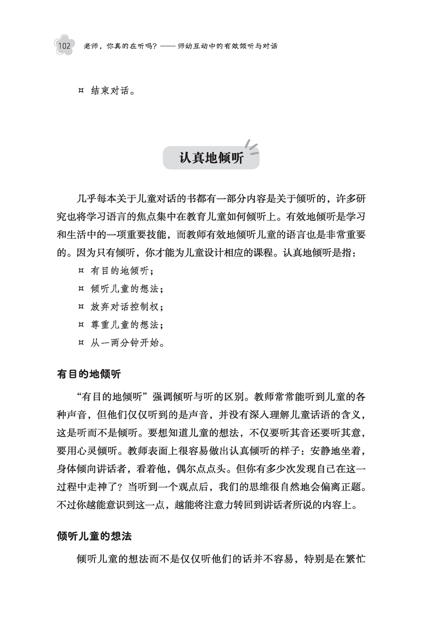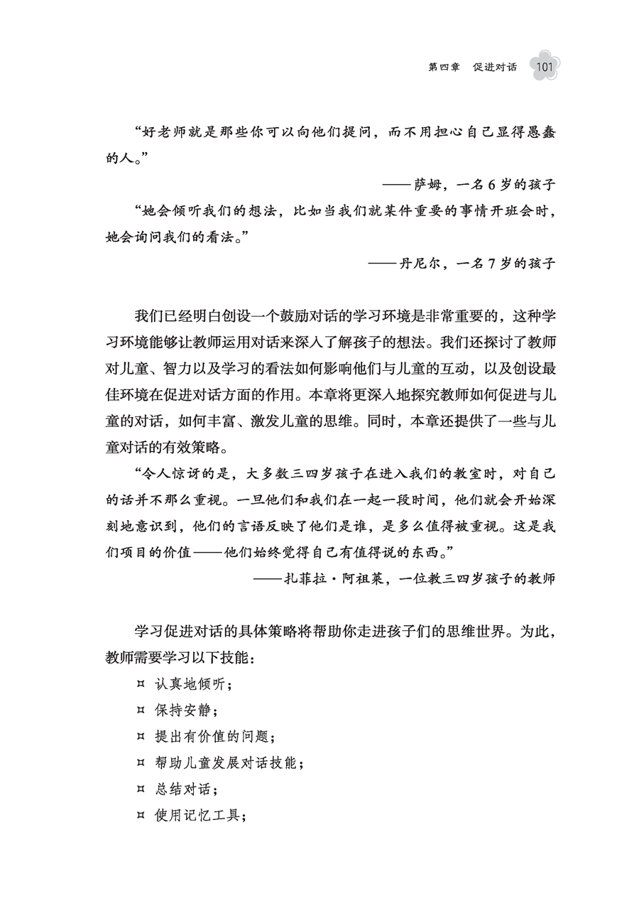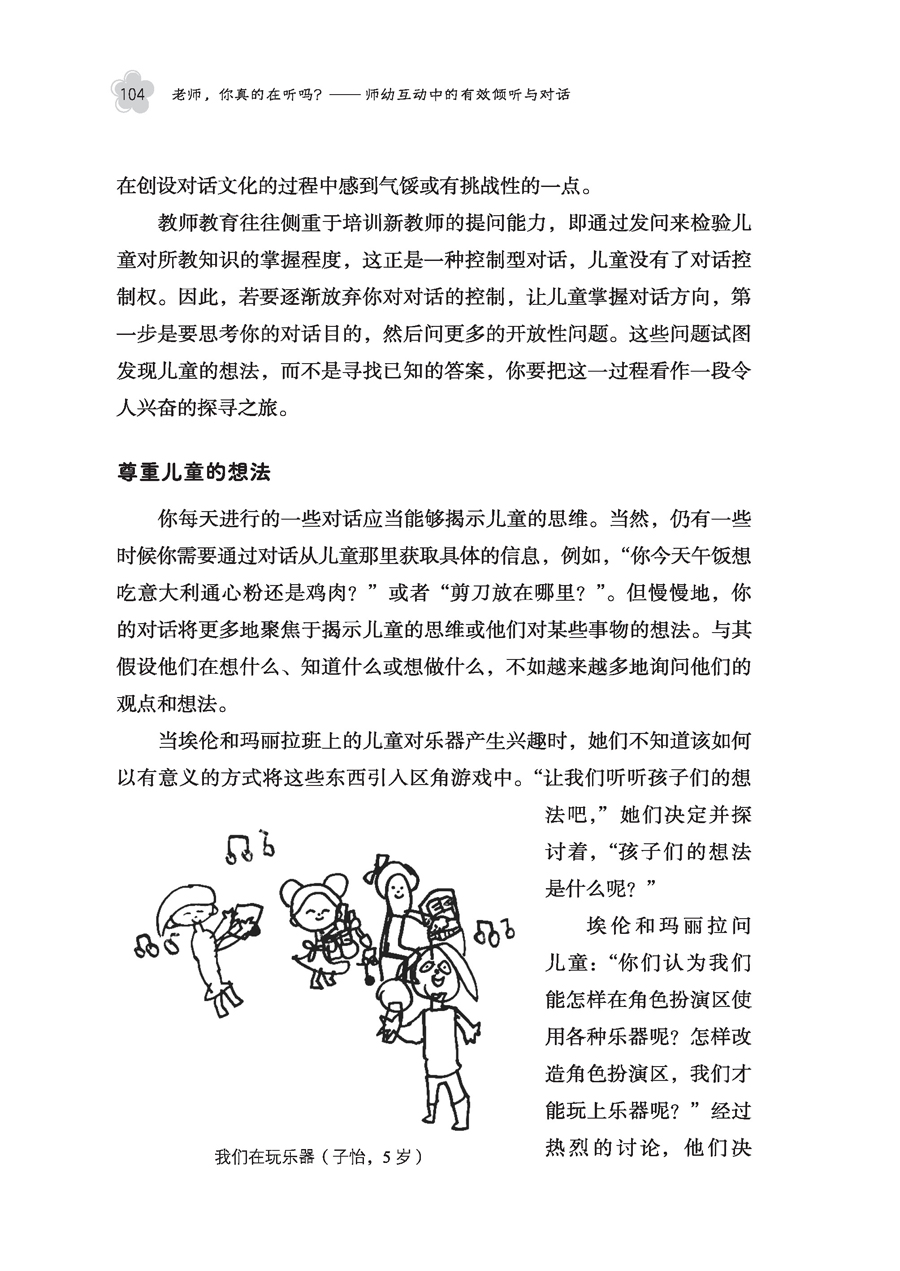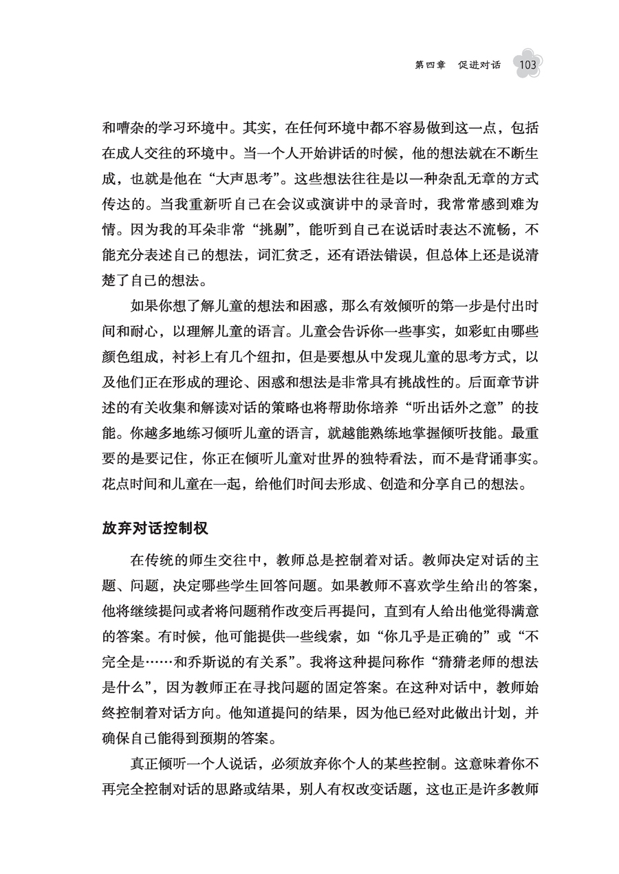 译者序 “所有人都在说,但没有人愿意听”,这是德国哲学家尼采(Nietzsche)对现代人缺乏倾听能力的深刻洞察,同时也是当下的教育弊病——课堂上教师滔滔不绝地讲授知识,却很少驻足观察,听听孩子们内心的声音,也没有给孩子们留出表达想法、交流感受的时间和空间。面对这样的教育困境,莉萨·伯曼(Lisa Burman)基于自身丰富的教学经验,于2009年推出了一本关于儿童教育的力作:《老师,你真的在听吗?——师幼互动中的有效倾听与对话》(Are You Listening?: Fostering Conversations that Help Young Children Learn)。莉萨是一位经验丰富的教师及学校领导,她在澳大利亚和美国的教育领域深耕多年,担任儿童护理中心、特殊教育学校的教育顾问。这些经历使她深刻认识到教育中存在的问题,尤其是教师与儿童之间缺乏对话和倾听。她因看到许多儿童在传统教育模式下学习的热情被磨灭、潜力未得到充分挖掘而深感痛心。通过不断探索和实践,她逐渐形成了自己的教育理念,并将其融入本书中,即适合所有人的、真实的、有意义的童年意味着享有玩耍的权利、能被包容和被充分倾听。如日本学者佐藤学(Manabu Sato)在《静悄悄的革命》(Jugyo O Kaeru Gakko Ga Kawaru)中提出的那样,莉萨认为“倾听”在教育中居于基础性地位,每个孩子天生就是一个强大的学习者,而其丰富的学习体验就建立在此基础上。 本书从儿童的学习与发展理论展开,以倾听和对话为教育抓手,深刻剖析了师幼对话中的一些核心关系,这些核心关系互相交织,共同构建起丰富的教育理念与实践策略体系。 倾听与听的关系。第一章“儿童的学习与你的儿童观”,旨在帮助我们区分“听”与“倾听”。“听”在教育中常表现为被动接收声音,教师可能仅听到儿童的话语,却未深入理解其内涵;而“倾听”是主动且有深度的行为,要求教师尊重儿童的学习特点和思维过程,用心感受、理解儿童话语背后的想法、情感和需求,进而建构“儿童是有能力的”这一儿童观。如在第一章的案例中,佩姬和戴夫两位教师在处理积木问题时,让孩子们协商解决。教师对儿童学习理论的看法和其持有的儿童观直接影响其教育实践,也是真正倾听发生的基础。 对话与学习的关系。第二章“教育环境中的对话”,探讨了师幼对话对儿童学习的重要性。通过对话,儿童能够思考,在表达想法的过程中梳理思维。通过对话,教师可以了解儿童的先前经验,据此创设学习情境,促进儿童思考。对话还为儿童的社会性学习提供情境,儿童在交流中倾听他人的观点,互相学习,共同解决问题,如在关于雪花工厂的讨论中,孩子们的思维得到了拓展,合作能力也得到了提升,该对话有力地促进了孩子们的学习。 对话与环境的关系。第三章“创设适宜的对话环境”,阐述了环境对师幼对话的重要性。在物理环境方面,教室的空间布局、材料选择与摆放等都会影响对话的发生和质量。合理的布局和丰富的材料能为对话提供更多机会和话题。一日活动安排也与对话紧密相关,教师应在儿童来园与离园、进餐、游戏等各个环节和时段,为自发性和促进性对话创造机会。此外,情感氛围也很关键,安全、信任、尊重的氛围能让儿童更自在地参与对话,充分表达想法。 对话中教师引导与儿童回应的关系。第四章“促进对话”,论述了教师在对话中可运用的具体策略,包括提问、让儿童出声思考、使用情境化语言、使用记忆工具以及保持安静等。但更重要的是处理好教师引导与儿童主动之间的关系。引导不是主导对话方向,教师不要急于用提问或其他工具来促进对话,引导的目的是让儿童自由表达,了解儿童的想法和认知图式,以及帮助儿童澄清和聚焦问题,建立知识联系。如教师可以说“谈谈你做的这个东西吧。你是如何做的?”,让儿童有更广阔的思考空间。 对话记录与解读的关系。第五章和第六章分别介绍了“记录对话”和“解读对话”。这两章是互相依存的,教师在实践中不能重记录而轻解读。记录对话是对儿童对话的保存,为解读提供素材,真实记录儿童的话语和表达。解读则是对记录的深入剖析,通过可视化、自我提问、联系先前知识与经验等策略,了解儿童话语背后的想法、知识储备和思维发展阶段。二者相辅相成,记录为解读提供基础,解读赋予记录以教育意义,帮助教师更好地理解儿童,为教学决策提供依据。 多主体在解读对话中的关系。第六章“解读对话”部分还谈到了解读对话涉及教师、家长等多个主体,也就是说,解读对话和了解真实儿童需要多主体共同合作。教师可以通过合作解读对话分享不同的视角,加深自己对儿童的理解。家长参与解读,可凭借自身对孩子更深入的了解,提供独特见解,帮助教师更好地把握儿童的想法。多主体合作能形成教育合力,共同促进儿童的成长和发展。 全班对话、小组对话与一对一对话的关系。在对话中,全班对话能营造集体氛围,拓展儿童图式;小组对话更具针对性,能让更多儿童参与,深入探究想法;一对一对话则能满足个别儿童的特殊需求,如与新来的孩子建立关系、挖掘某个孩子的独特想法等。第七章“倾听语言发展中的儿童”,更是对儿童发展差异性的进一步论述,强调理解安静的儿童,接受儿童的现状,关注其强项和能力,而非只盯着他们的不足。教师可以安排儿童与关系亲密、能给予其支持的伙伴一起交流,避免爱说