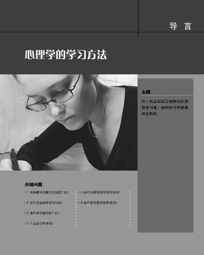 你在读这本教材!身为作者,这令我们非常高兴(真的!)。许多学生总是习惯打开教材,把它从头到尾翻阅一遍就完事了。这很令人遗憾,因为更好的学习方法应该是研究教材,而不只是翻翻它。请你认真想想,在读完了一章内容之后,你到底记住了多少?如果答案是“没记住”或“没记住多少”,原因恐怕在于阅读与研究是两码事。即便你是个优秀的学生,你依然需要提高自己的学习技能。成绩优异的学生不仅仅是学习时间更长、更刻苦,他们的学习方法也更为得当(Santrock & Halonen,2010),考试过后很久,他们依然能够记得和理解自己学过的知识。对他们来说,心理学事关自己的生活,而不仅仅是考试。为了使你有一个良好的开局,请仔细阅读下面推荐的几种方法,来提高你的学习能力。