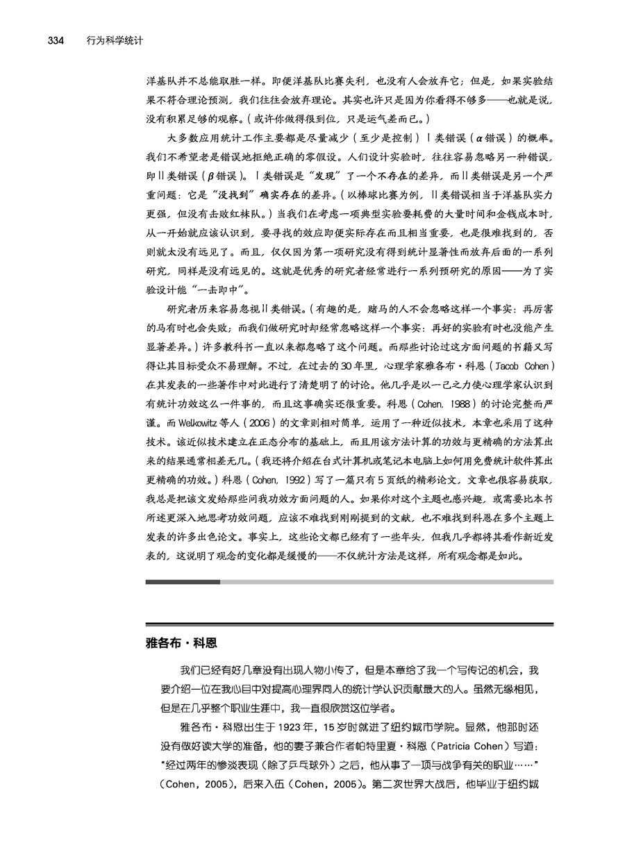 这一版有一个重要补充,就是增加了关于元分析的章节。元分析是同时对众多研究进行分析。例如,关于抑郁症治疗已经有了许多研究。对抑郁症的元分析就是将所有这些研究结合起来,并试图根据这些或相似、或不同的发现得出新的结论。目前对循证医学的重视就是一个很好的例子。例如,如果我要接受癌症治疗,我希望这种治疗依据的不仅仅是上周发表的最新研究,也不仅仅是我的肿瘤科医生最喜欢的研究。在这种情况下,我们真正需要的是,行为科学不仅限于判断统计学意义是否显著,更要重视效应量的大小。20年前的统计学导论教材是不会介绍对于众多研究的元分析方法的。