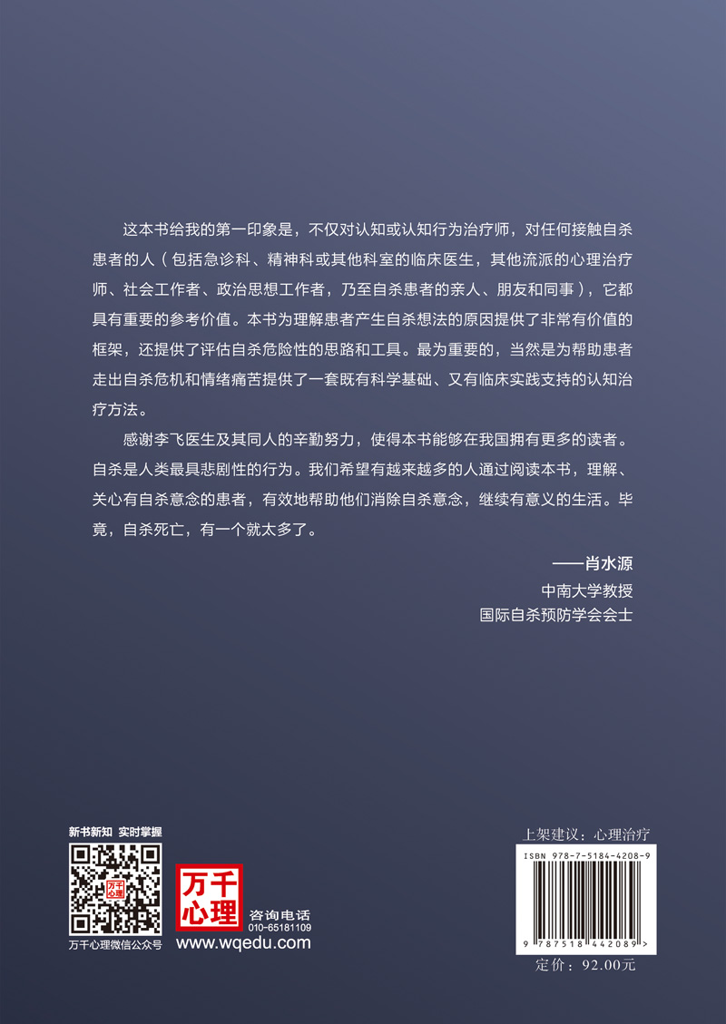全书分为三个部分,包括认知理论对自杀的理解、应用于临床治疗的一般原则和干预阶段,以及在三类特殊人群中的应用,可为自杀行为的治疗与研究提供非常详尽的参考。