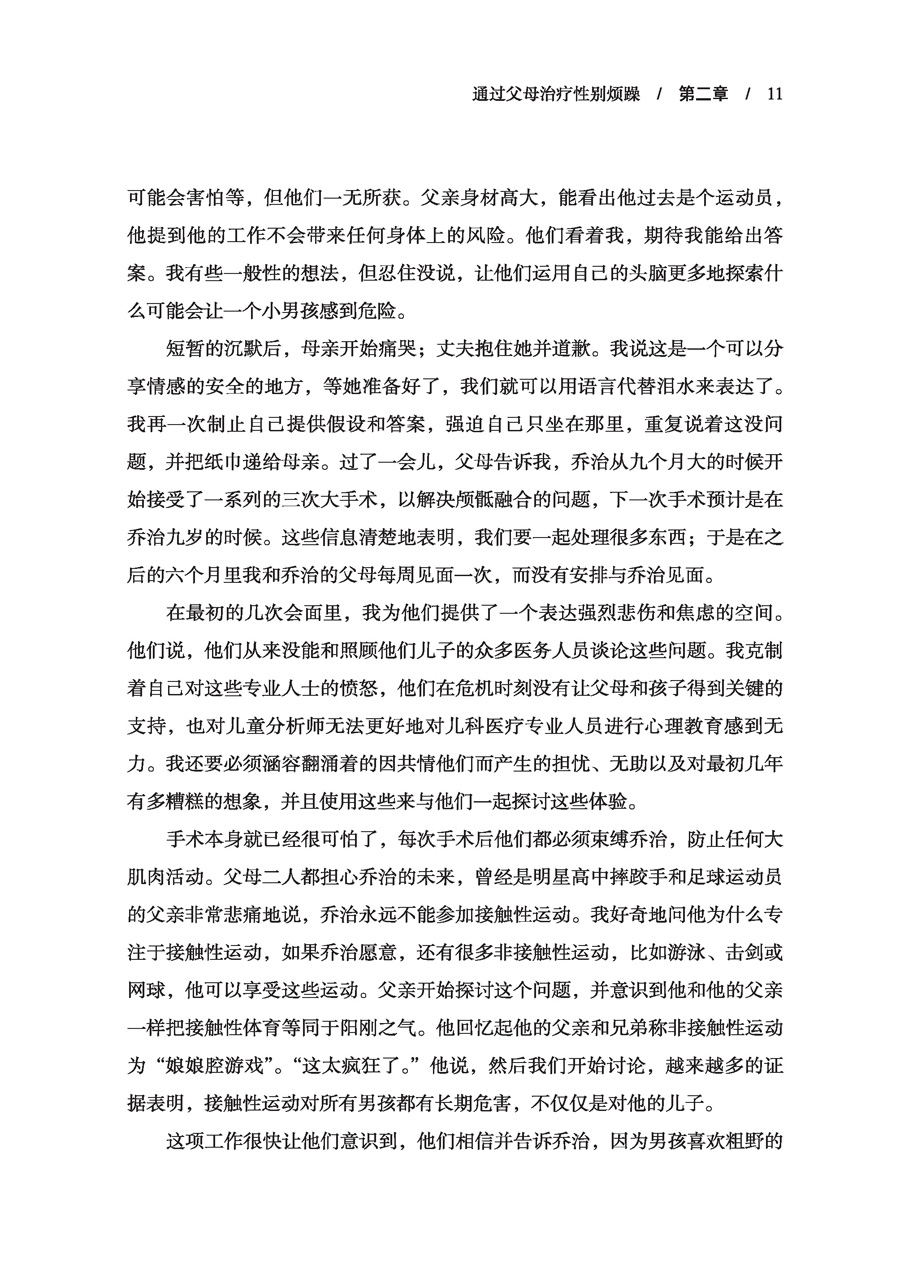 在向我澄清医疗干预的历史和预后的过程里,父母有机会练习如何和乔治谈论他还是婴儿时发生的可怕事情,以及如何就他的状况对他做出适当的解释。然后乔治告诉他们,他记得自己曾经被束缚,受到了限制。他回忆起自己的沮丧、恐惧和愤怒,透露说他觉得好像因为自己是个坏男孩而受到惩罚。当我好奇乔治是否在手术与作为男孩的危险之间建立了额外的联系时,父母想起在他六岁时,他的姐姐出于她自己的恐惧而告诉乔治,女孩从来不需要做那种手术。