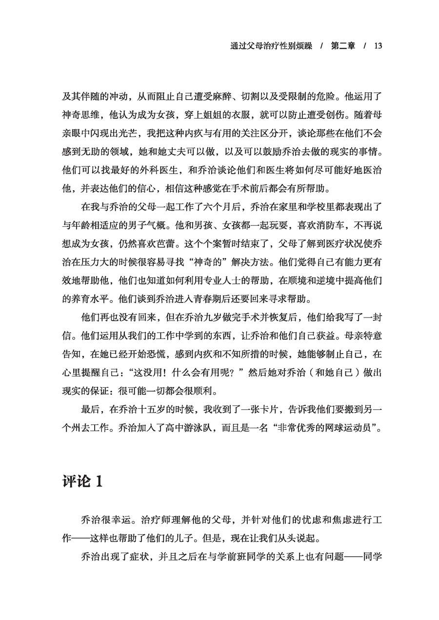 在我与乔治的父母一起工作了六个月后,乔治在家里和学校里都表现出了与年龄相适应的男子气概。他和男孩、女孩都一起玩耍,喜欢消防车,不再说想成为女孩,仍然喜欢芭蕾。这个个案暂时结束了,父母了解到医疗状况使乔治在压力大的时候很容易寻找“神奇的”解决方法。他们觉得自己有能力更有效地帮助他,他们也知道如何利用专业人士的帮助,在顺境和逆境中提高他们的养育水平。他们谈到乔治进入青春期后还要回来寻求帮助。