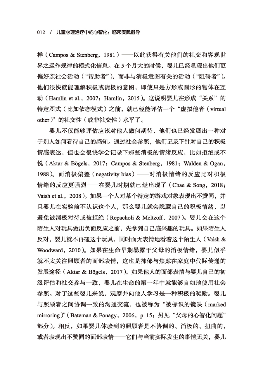 从第二章开始,正式介绍基于心智化的儿童心理治疗方法。第二章描述了心智化儿童治疗的理论依据,深入探讨了重要概念和理论框架;第三章介绍了该治疗方法适用的目标群体,以及相关的评估工具;第四章介绍了进行心智化儿童治疗时的治疗策略和指导建议,勾勒了整体的治疗框架,并制定了基本治疗原则和立场;第五章描述了心智化儿童治疗如何应用于父母;第六章聚焦于观察方法,将其作为提高心理治疗技能的一种工具;第七章至第九章描述了在实践经验中观察到的心智化儿童治疗的三组技术,分别为注意调节、情感调节和心智化;第十章总结了在进行治疗的过程中可能出现的议题,涵盖了相识、治疗设置及治疗中的不同阶段;最后的第十一章讨论了研究课题,为未来的研究指明了道路。