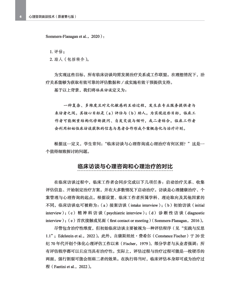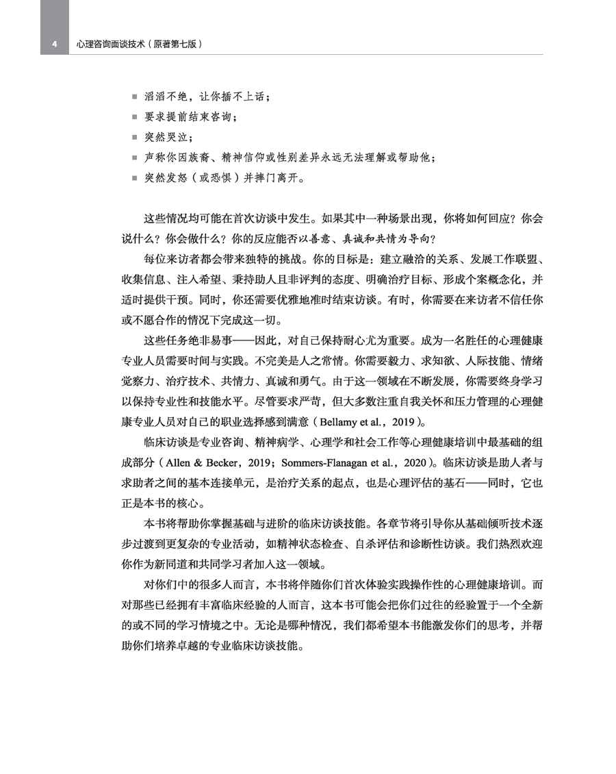 临床访谈(面谈)是心理咨询与治疗中的核心技能,也是专业成长的基石。作为该领域的重要教材,《心理咨询面谈技术》(原著第七版)融合了理论与实务的新进展,系统阐释了临床访谈的科学方法与艺术实践,并注重真实咨询场景中的关键技能。本书广泛涵盖文化敏感性评估、个案概念化、治疗计划制订及社会心理干预等关键内容,在延续作者一贯倡导的“关系导向”访谈理念的基础上,增补了大量前沿研究成果、多元真实案例与包容性表述,进一步强化文化视角整合,并突出循证实践导向。本书还包括以下内容特点: