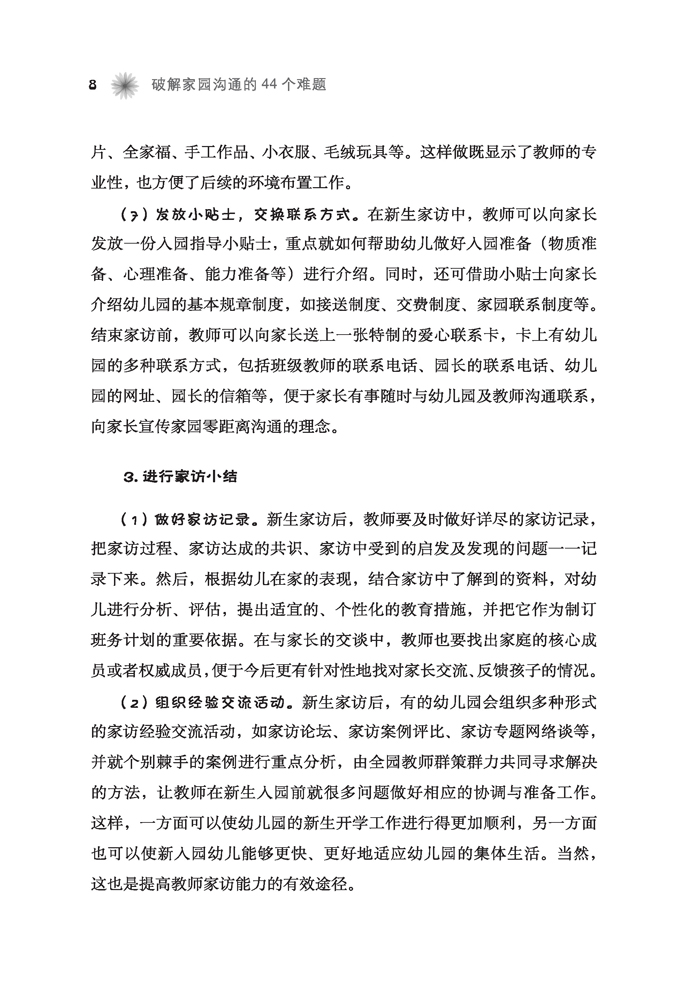 作为幼儿教师,每天要面对的不仅仅是幼儿,还有我们的家长朋友。我从幼儿师范学校毕业后先在幼儿园当了14年的一线教师,后又担任了12年的园长,其间接触过许许多多不同职业、不同个性、不同教育背景的家长朋友。家长作为教师的合作者加入到教育者一方,共同对受教育者──幼儿施教,将极有利于提高教育的质量。但是现实生活中能否发挥家长的合作者作用,还受到许多条件的制约,其中教师与家长的沟通是最重要的条件之一。世界上很多国家和地区都把与家长沟通的技能作为幼儿教师必备的基本功,足见其在幼儿教育中的重要性。