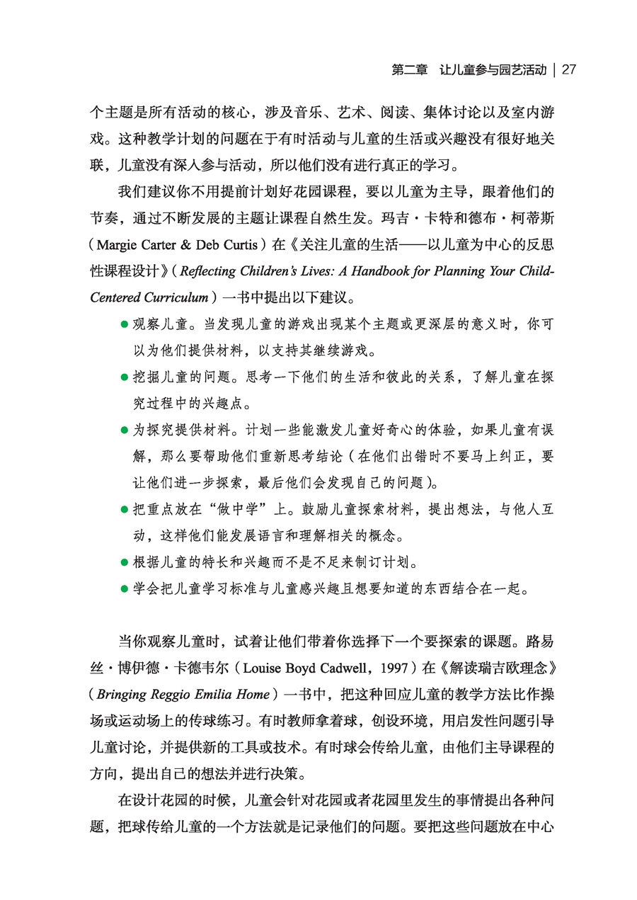 培养儿童对园艺的兴趣 如果教师要开展园艺课程,那么必须先培养儿童在园艺方面的想法和兴趣。你此时的目标就是在儿童进行实际的园艺活动前,在班级里创设一种让他们讨论和交流的氛围。在春天的时候,儿童经常会被外部世界的变化吸引。你可以充分抓住儿童的好奇心,在班上的图书角添加园艺方面的书籍。你还可以在圆圈活动时介绍一些关于园艺的诗歌、歌曲和故事,让大家对园艺展开讨论。你也可以在教室里悬挂一些花园或花卉的图片,或者带孩子们在大自然中徒步寻找春天的痕迹,通过这样的引导让儿童口头分享他们以前关于植物和花园的经历。如果你在秋天才开始园艺课程,那么你就需要寻找一些要播种的植物,收集一些种子,并进行观察。提供一些常见的园艺道具,供儿童进行角色扮演游戏,能够帮助他们回忆关于花园的活动,鼓励他们进行更多的讨论。在几天的时间内,你会发现哪些孩子之前有在花园里做园艺的经历,你可以鼓励这些孩子在集体讨论时分享自己的故事。每天你都应尽可能地鼓励儿童针对种植与收获方面的先前经历进行对话和交流,这些活动会让他们掌握一些关于园艺的基本知识和词汇。 通过生成课程进行园艺教学 很多幼儿教育课程都围绕一个教师提前选好的主题为儿童规划活动。这个主题是所有活动的核心,涉及音乐、艺术、阅读、集体讨论以及室内游戏。这种教学计划的问题在于有时活动与儿童的生活或兴趣没有很好地关联,儿童没有深入参与活动,所以他们没有进行真正的学习。 我们建议你不用提前计划好花园课程,要以儿童为主导,跟着他们的节奏,通过不断发展的主题让课程自然生发。玛吉·卡特和德布·柯蒂斯(Margie Carter & Deb Curtis)在《关注儿童的生活——以儿童为中心的反思性课程设计》(Reflecting Children’s Lives: A Handbook for Planning Your Child-Centered Curriculum)一书中提出以下建议。 ·观察儿童。当发现儿童的游戏出现某个主题或更深层的意义时,你可以为他们提供材料,以支持其继续游戏。 ·挖掘儿童的问题。思考一下他们的生活和彼此的关系,了解儿童在探究过程中的兴趣点。 ·为探究提供材料。计划一些能激发儿童好奇心的体验,如果儿童有误解,那么要帮助他们重新思考结论(在他们出错时不要马上纠正,要让他们进一步探索,最后他们会发现自己的问题)。 ·把重点放在“做中学”上。鼓励儿童探索材料,提出想法,与他人互动,这样他们能发展语言和理解相关的概念。 ·根据儿童的特长和兴趣而不是不足来制订计划。 ·学会把儿童学习标准与儿童感兴趣且想要知道的东西结合在一起。