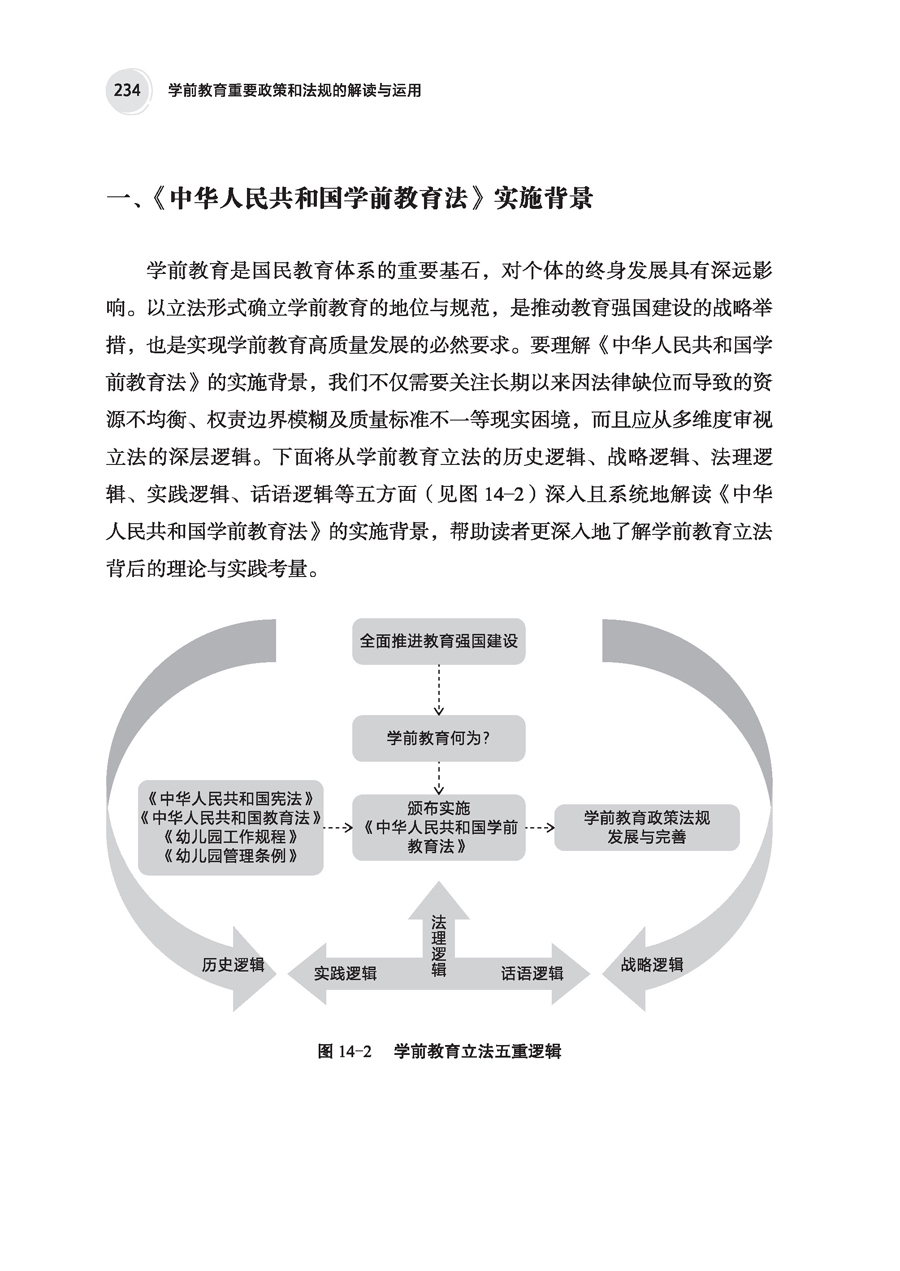 学前教育是国民教育体系的重要基石,对个体的终身发展具有深远影响。以立法形式确立学前教育的地位与规范,是推动教育强国建设的战略举措,也是实现学前教育高质量发展的必然要求。要理解《中华人民共和国学前教育法》的实施背景,我们不仅需要关注长期以来因法律缺位而导致的资源不均衡、权责边界模糊及质量标准不一等现实困境,而且应从多维度审视立法的深层逻辑。下面将从学前教育立法的历史逻辑、战略逻辑、法理逻辑、实践逻辑、话语逻辑等五方面(见图14-2)深入且系统地解读《中华人民共和国学前教育法》的实施背景,帮助读者更深入地了解学前教育立法背后的理论与实践考量。