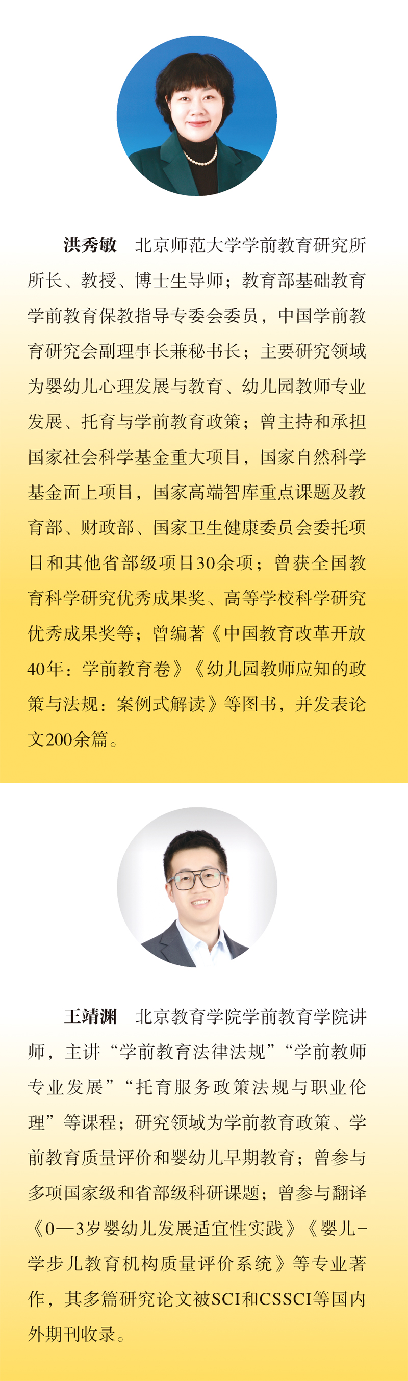 北京师范大学学前教育研究所所长、教授、博士生导师;教育部基础教育学前教育保教指导专委会委员,中国学前教育研究会副理事长兼秘书长;主要研究领域为婴幼儿心理发展与教育、幼儿园教师专业发展、托育与学前教育政策;曾主持和承担国家社会科学基金重大项目,国家自然科学基金面上项目,国家高端智库重点课题及教育部、财政部、国家卫生健康委员会委托项目和其他省部级项目30余项;曾获全国教育科学研究优秀成果奖、高等学校科学研究优秀成果奖等;曾编著《中国教育改革开放40年:学前教育卷》《幼儿园教师应知的政策与法规:案例式解读》等图书,并发表论文200余篇。